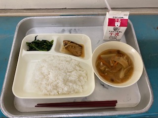 今日の給食は、なまりぶしのしょうが煮 なめこのみそ汁 ほうれんそうのごまあえ でした。