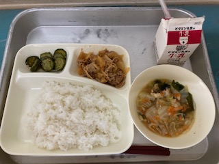 今日の給食は、豚肉のコチジャンいため 鶏肉とはるさめのスープ きゅうりのナムル でした。