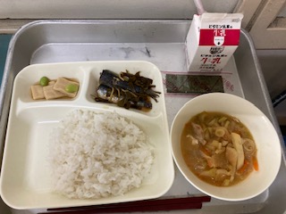 今日の給食は、いわしのしょうが煮 みそ汁 高野どうふの煮もの 焼きのり でした。