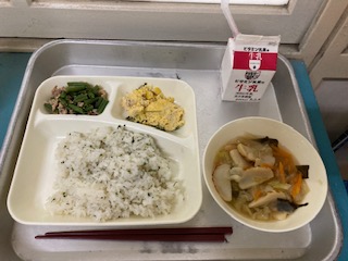 ?今日の給食は、具だくさん卵の千草焼き 五目汁 豚肉とさんどまめのいためもの でした。
