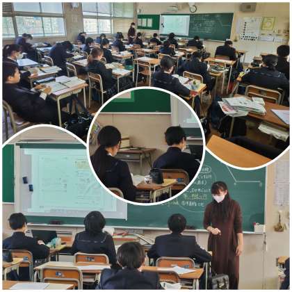 分割授業を行っています。コンパスを使って垂直二等分線を作図する練習をしています。