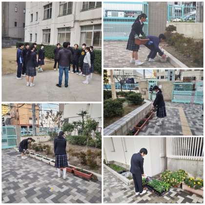 本日放課後、1年生から3年生までの美化委員さんが、草花を植えたプランターを玄関わきに並べ水まきをして、冬の校内美化に一役を買ってくれました。