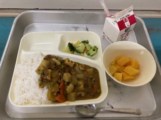 今日の給食は、冬野菜のカレーライス ブロッコリーとコーンのサラダ 黄桃(カット缶) でした。