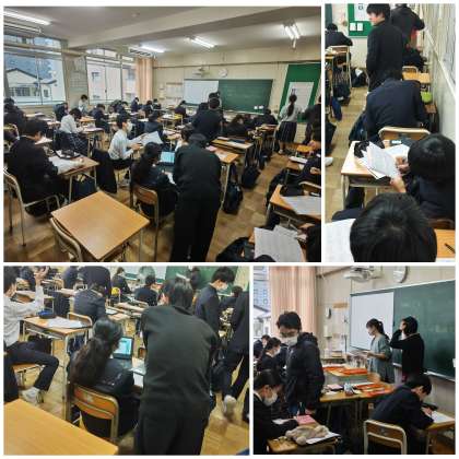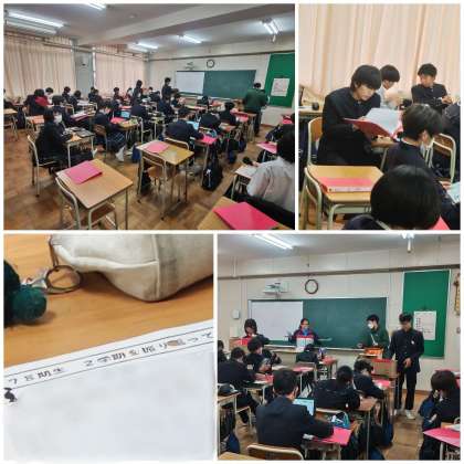 12月に入り、2学期も終わりに差し掛かるところ。明後日から懇談も始まります。2年生では、学活の時間に2学期のふり返りプリントに自身の今学期の様子をまとめて書いたり、授業アンケートなどに取り組んでいます。