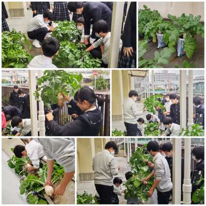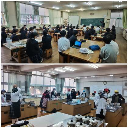 1年生では、これまで技術科で栽培してきた「田辺大根」を収穫し、それを家庭科で「豚バラ大根」に調理しました。自分たちで育てて収穫した地元の野菜を使った料理に生徒たちはいつもの調理実習より一層楽しそうに取り組んでいました。田辺大根は一般の大根に比べ苦みが少ないといわれますが、生徒たちにはちょっとほろ苦かったとのことです。