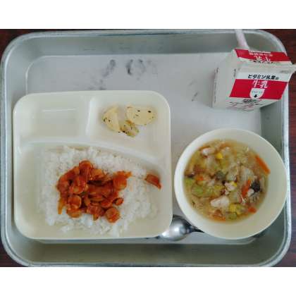 本日の給食は、牛乳、ケチャップライス、スープ、ジャガイモのバジル焼きでした。