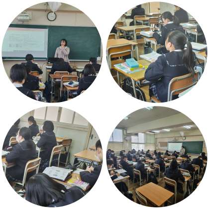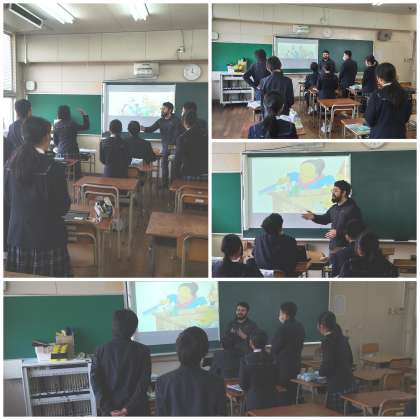 ピクチャーディスクライビング(イラストを見て英語で様子を表現する活動)をしたり、日常の1シーンを過去進行形を使って表現しているスキットを聞いたりしています。