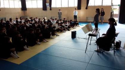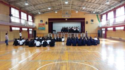 2時間目、1年生は、武道場で学年合唱の練習です。