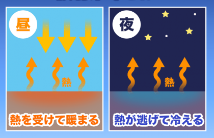 ところで皆さんは、なぜ雲の日は気温があまり下がらないか知っていますか?夜に温度が下がるのは、昼間に温められた地面の熱エネルギーが、上空に放出されていくからです。雲がなければ熱エネルギーは上空からさらに宇宙に放出されていきますが、雲があるとそこで反射されて熱エネルギーは地上に戻ってきます。そのため温度があまり下がらないのです。逆にお天気が良くて雲一つない夜は、冷えてしまします。これを放射冷却といいます。