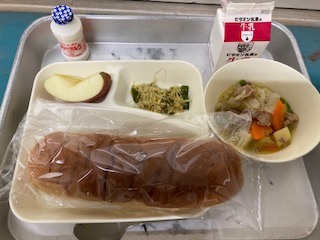 今日の給食は、豚肉と野菜のスープ煮 カレーソテー りんご 発酵乳 でした。