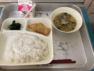 今日の給食は、たらフライ うすくず汁 ほうれんそうのおひたし でした。