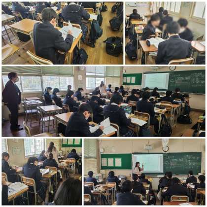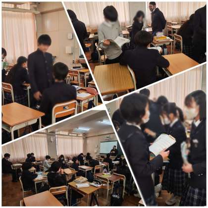 2年生の英語の授業では、二つのもののうちどちらのものの方がいいか説得力のある主張ができるよう練習しています。また、1年生の数学の授業では、円錐を展開してその表面積を求める方法について考え、練習問題にも取り組んでいます。
