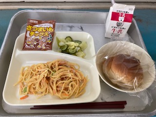 今日の給食は、さけのクリームスパゲッティ キャベツときゅうりのサラダ おさつチップス でした。