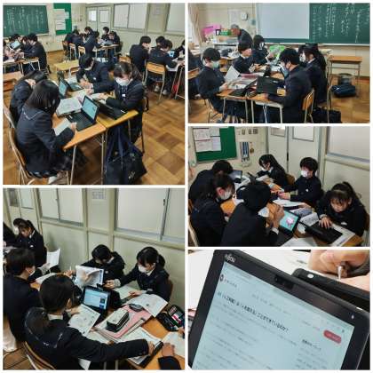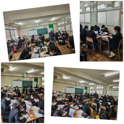 この日、1組では国語の最後の授業となりました。最近の授業では、高校入試に向けた問題に取り組むことが多かったですが、最後の授業ということで、将来を見据えた問題について考えたことを書き残す授業を行いました。