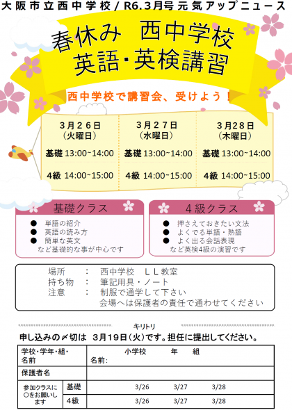 春休みに、小学生対象の英検講習会を西中学校で行います。英語の勉強をしたい人、英検に興味のある人など、ふるってご参加ください。