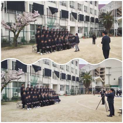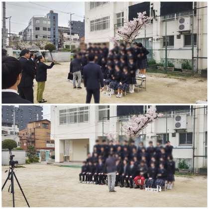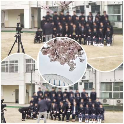 始業式後、満開の桜を背景に各学級の集合写真撮影を行いました。