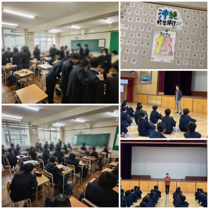 学年集会で先生方からいろいろなお話を聞いたり、各クラスにて修学旅行の部屋割りや座席を決めたり、と2週間を切った修学旅行へ向けて大詰めの取り組みを行っています。