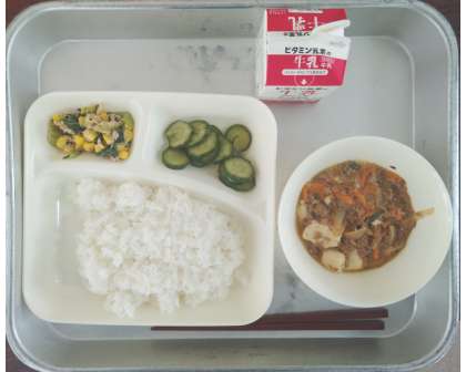 本日の給食は、ごはん、牛乳、マーボーどうふ、きゅうりの中華あえ、ツナとチンゲンサイのいためものでした。