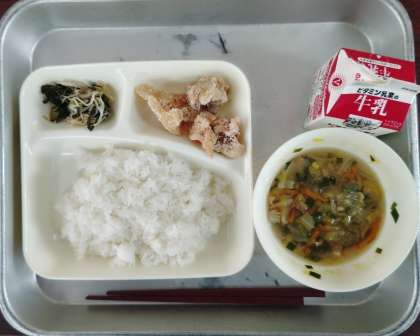 本日の給食は、ごはん、牛乳、鶏肉のからあげ、中華スープ、チンゲンサイともやしの甘酢あえ でした。