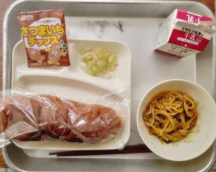 本日の給食は、カレースープスパゲッティ、キャベツのピクルス、おさつチップス でした。