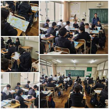 谷川俊太郎「朝のリレー」を題材に学習をしています。文中に出てくるさまざまな国々は世界のどこに位置しているのか、地図帳を出してみんなで確認したり、それぞれの国の文化などについて知っていることはどんなことか意見を出しあっています。