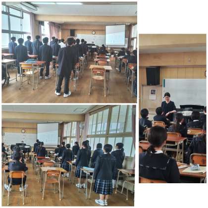 うまく発声して歌うにはどうしたらいいのか、スライドを観ながら学習し、男子、女子に分かれてそれぞれ校歌を歌って実際に練習しています。