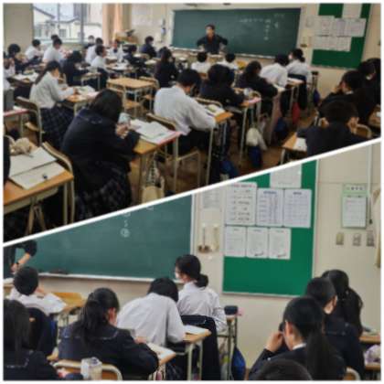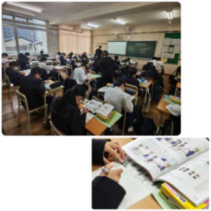 ワークシートを使って、自分の名前や出身などを話している会話を聞いて、それを書き 取っています。