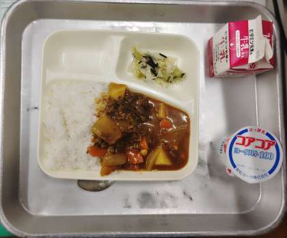 本日の給食は、牛乳、牛肉と大豆のカレーライス、キャベツのひじきドレッシング、ヨーグルト、でした。
