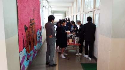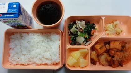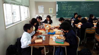 今日は、実習生の松尾さんが、1年2組で一緒に給食を食べました。
