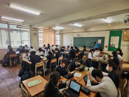 タブレットを用いて修学旅行の出来事をまとめた新聞作りをしています。