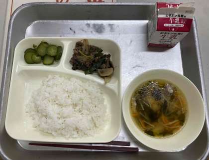 本日の献立は、ごはん、プルコギ、豆腐とわかめのスープ、きゅうりの甘酢づけ、牛乳です。