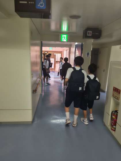 朝6時30分に起床し、健康観察、部屋の清掃を行いました。昨晩はどの生徒もぐっすり眠って、健康面も問題ありません。これから、朝の集いへ向かいます。