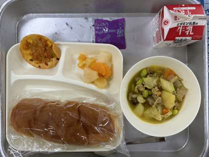 本日の給食は、パン、牛乳、豚肉と野菜のカレースープ煮、変わりピザ、ミックスフルーツ(缶) でした。