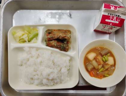 本日の給食は、ごはん、牛乳、ちくわのいそべあげ、あつあげとさといものみそ煮、あっさりキャベツ、でした。