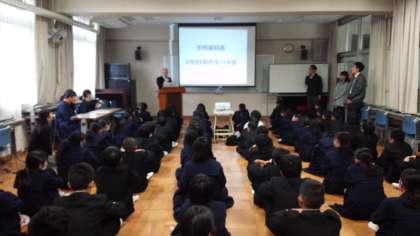 保健委員会代表生徒からの報告に続いて、学校歯科医の、河野 好昭 先生から、パワーポイントを使って、詳しくご講話をいただきました。