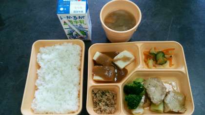 『のっぺい汁』・・・さといも、だいこん、ごぼう、にんじん、と具材が豊富で、全国に分布する郷土料理の一つです。でんぷんなどでとろみがつけられているのが特徴です。漢字では、濃餅汁と書きます。汁につけられたとろみが、餅がとけたもののように見えることから、この名前がつけられたとのことで。(献立表から)