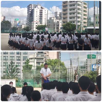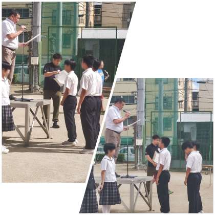 空が夏の朝の顔をのぞかせる中、全校集会を行いました。陸上部で優秀な成績を残した生徒たちが表彰されました。