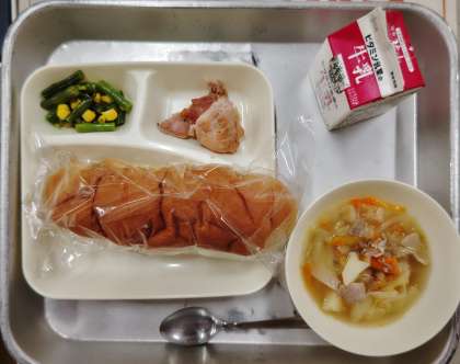 本日の給食は、パン、牛乳、鶏肉のガーリック焼き、スープ、さんどまめとコーンのサラダでした。