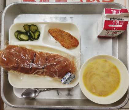 本日の給食は、パン、牛乳、サーモンフライ、豆乳スープ、きゅうりのバジル風味サラダ、固形チーズでした。