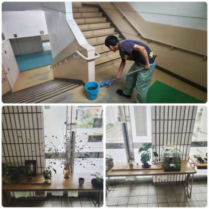 生徒の皆さんが期末テストに集中している陰で、施設管理補助員さんが廊下や階段の水を切って滑らないようにしてくださっています。