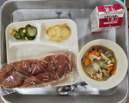 本日の給食は、パン、牛乳、鶏肉とてぼ豆のスープ煮、ベーコンとじゃがいものチーズ焼き、きゅうりとコーンのサラダでした。