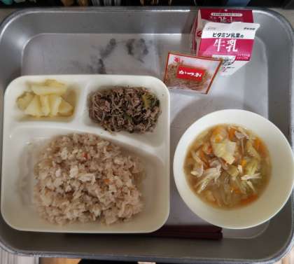 本日の給食は、かやくご飯、牛乳、ゴーヤチャンプルー、かつおぶし(袋・ゴーヤチャンプルー)、五目汁、あげ焼きじゃがでした。