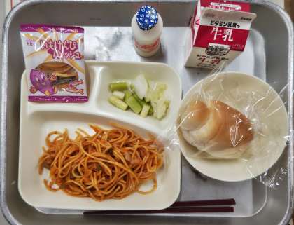 本日の給食は、チキントマトスパゲッティ、グリーンアスパラガスとキャベツのサラダ、発酵乳、いもけんぴフィッシュでした。