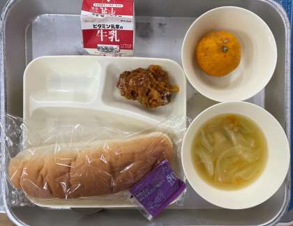 本日の給食は、パン、牛乳、かぼちゃのミートグラタン、鶏肉と野菜のスープ、みかん(冷)でした。