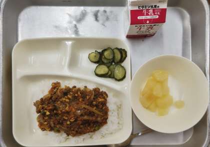 本日の給食は、牛乳、大豆入りキーマカレーライス、きゅうりのサラダ、洋なし(カット缶)でした。2学期も引き続き、みんなモリモリ食べてくれるので、残食が少ないです。