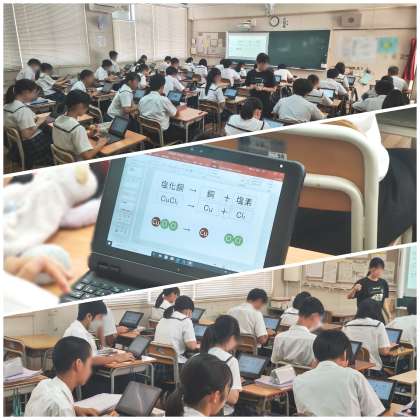 塩化銅を塩素と銅に分離する化学反応式をパワーポイントを使ってスライド化してみたりしています。