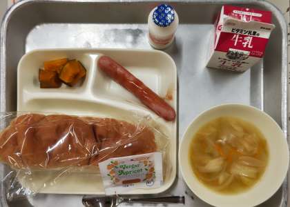 本日の給食は、牛乳、コッペパン、ウインナーのケチャップソース、スープ、焼きかぼちゃ、発酵乳、アプリコットジャム でした。