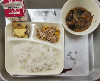 本日の給食は、ごはん、牛乳、マーボーなす、ツナと野菜のいためもの、焼きさつまいもの甘みつかけでした。