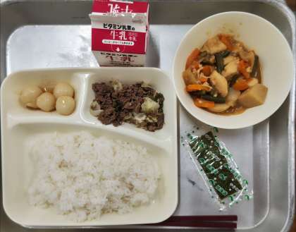 本日の給食は、ごはん、牛乳、一口がんもとさといものみそ煮、牛肉と野菜のいためもの、みたらしだんご、焼きのりでした。