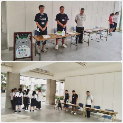 来年度入学予定の校区内児童を対象とした部活動オープンスクールを行いました。2日間にわたる行事の初日は、開始30分ほどで雷雨により運動部の活動が制限されるなどありましたが、たくさんの方が来校しました。